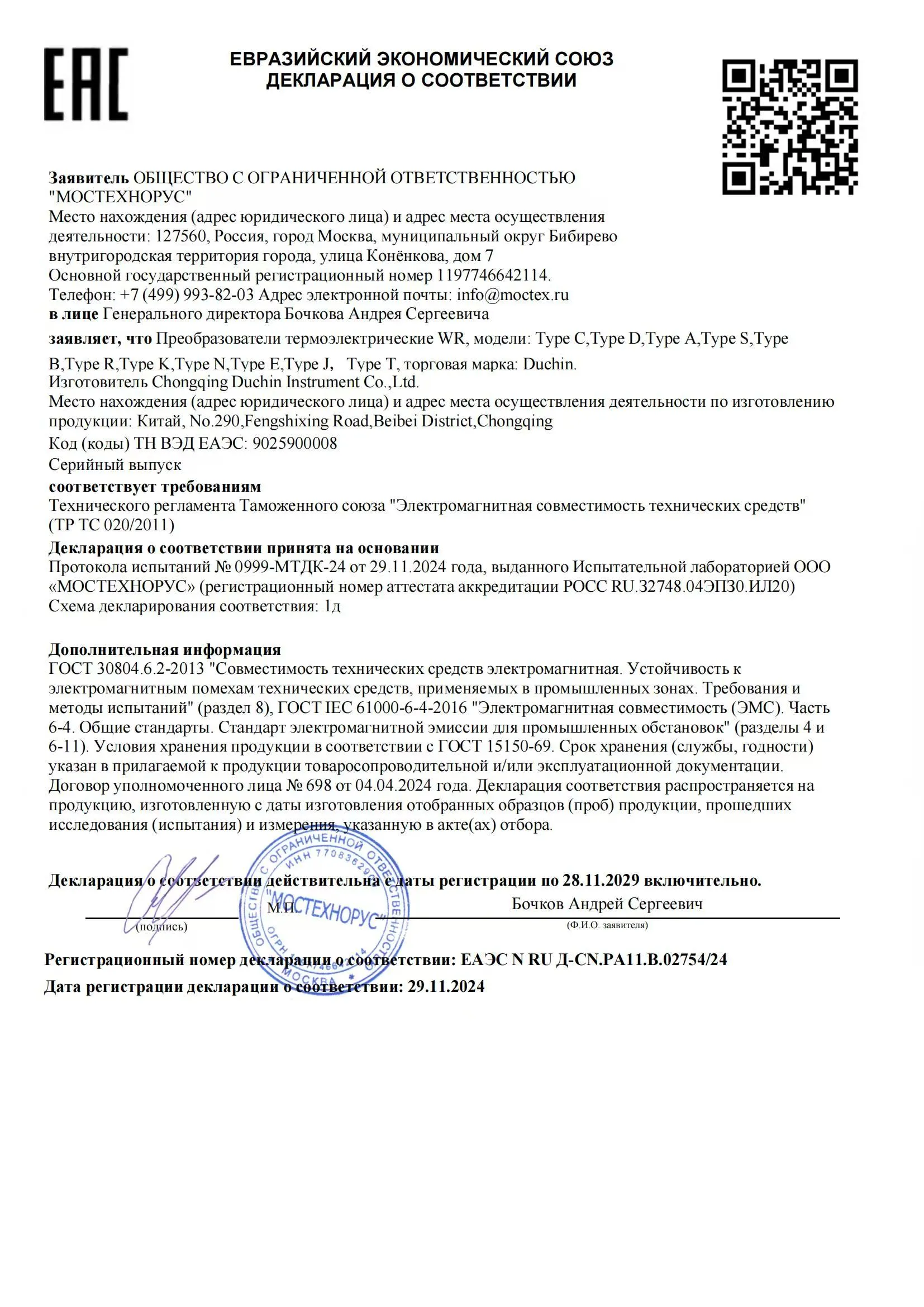 Наша компания, производитель термопар с 30-летним профессиональным опытом, успешно прошла сертификацию и получила аккредитацию Евразийского экономического союза (ЕАС). Мы можем изготавливать на заказ полный спектр термопар в соответствии с потребностями заказчика. Сертификация ЕАС распространяется на модели термопар K, N, E, J, T, S, R, B, C, A и D.